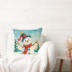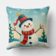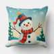 Um boneco de desenho animado com um cachecol e chapéu em meio a árvores de neve sob um céu sereno e crepúsculo.