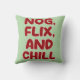 A funny jolly nog flix and chill happy holidays Christmas season humor slogan illustrated deluxe unique home décor throw pillow cushion. Get a cute winter holiday season motto pillow today. Have a happy holiday with this super cute holly jolly Christmas design.