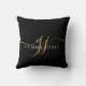 Um travesseiro decorativo na moda moderno chic com um monograma preto-ouro com uma escrita dramática inicial com baloiços e o seu nome de cheio. Simples elegância. O fundo tem um efeito texturizado visual. Dourado em preto.