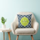 Um elegante travesseiro decorativo quadrado azul quatrefoil, com padrão marinho, com um crachá escalpado em um verde primavera vibrante que você pode personalizar adicionando seu nome e monograma inicial. Esta é parte da Coleção de Primaveras Azul e Almoço de Limão.