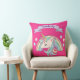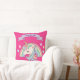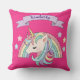 Este travesseiro decorativo personalizado bonito e colorido apresenta uma bela ilustração de um arco-íris unicórnio e colorido pastel, sobre um fundo rosa quente. Pequenas estrelas em cores compatíveis rodeiam o arco-íris. Uma faixa é impressa acima do unicórnio com um nome de exemplo impresso abaixo em uma fonte elegante de script púrpura. Você pode personalizar o travesseiro para incluir seu próprio nome personalizado ou texto.