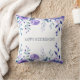 Elegante travesseiro "Reforma Feliz" com o nome do funcionário reformado nas costas, juntamente com o mês e o ano da reforma. O travesseiro tem um elegante quadro floral de flores violetas roxas com folhas verdes-azuladas.