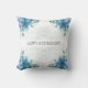 Elegante travesseiro "Reforma Feliz" com o nome do funcionário reformado nas costas, juntamente com o mês e o ano da reforma. O travesseiro tem um elegante quadro floral de flores azuis com folhas azuladas-verdes.
