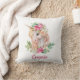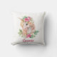 Um unicórnio giro adorável com flores cor-de-rosa no travesseiro decorador de criança branca. Personalizado com um nome em uma fonte de script fofa.