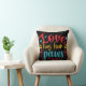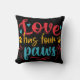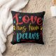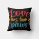 Travesseiro decorativo colorido e divertido para amantes de cachorros apresenta texto legal de vermelho, amarelo e azul em um fundo que você pode mudar para qualquer cor que quiser, e texto que lê Amor tem quatro patas!