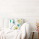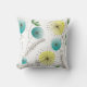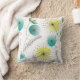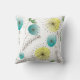Os pulsos de disparo modernos do dente-de-leão do travesseiro do meio século descansam nas máscaras de amarelo e do azul com folhas em um branco, fundo do verde. Para trás do travesseiro com design de coordenação e assinado pelo artista, Gail Gabel.