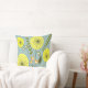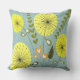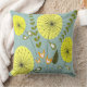 Os pulsos de disparo modernos do dente-de-leão do travesseiro do meio século descansam nas máscaras de amarelo e de verde em um fundo textured verde do OLHAR da hortelã. Para trás do travesseiro com design de coordenação e assinado pelo artista, Gail Gabel.