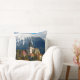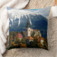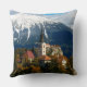 O travesseiro decorativo da foto com a ilha pequena com a igreja cercada por árvores em cores da queda no lago sangrou com na neve do fundo nos picos dos cumes julianos no outono em Slovenia.