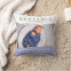A moderna e moderna almofada de manutenção. Design da fotografia do bebê e do pincel em cor branca e azul e do nome do bebê, data de nascimento, peso, comprimento, tempo de nascimento, etc., escritos em caracteres modernos a preto e branco. Por favor, não hesite em contactar-me se precisar de ajuda com este design.