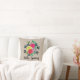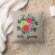 Um travesseiro decorativo personalizado que apresenta o texto "Hello Primavera" junto com uma imagem de rosas coloridos contra um fundo Dhurrie Beige.