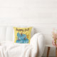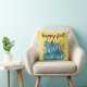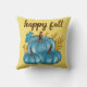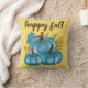 Almofada de lançamento de abóboras azuis de outono! Tipografia moderna e tendência diz "feliz outono". Três abóboras azuis fofas e coloridas com folhas de outono. Fundo dourado de outono. Bom e confortável!