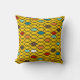 Este travesseiro decorativo tem uma design de ovais da década de 1970 em vermelho, laranja, marrom, branco e azul em um campo de ouro.