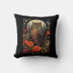 A pillow with a cool looking owl with a piercing stare. A full moon in the back with a garden of red flowers.