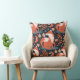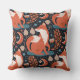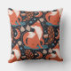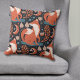 Uma raposa vermelha é a principal característica do padrão deste travesseiro decorativo distinto. A imagem da raposa é rodeada por flores, folhas, símbolos e luas em crescente. As cores predominantes incluem marrom-canela, azul-ardósia, bronzeado e azul-marinho. Ambos os lados têm a mesma imagem.