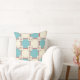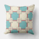 Sempre que vislumbro uma cortina ou avental da década de 1940 num mercado de flores, encontro os cheiros reconfortantes e a sensação de que a cozinha da vovó me inundou. Tão agradável, eu queria compartilhar a experiência ao criar a aparência e a sensação em novos tecidos e produtos para decoração de casas. O design neste travesseiro decorativo amoroso empresta seu esquema de cores de aqua suave, marfim, cinza de cinzas e padrão de azulejo vermelho e em camadas a partir do fundo de uma toalha de mesa de 1940. O dorso é aqua sólida.