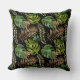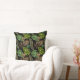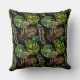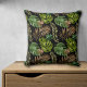 Este travesseiro brilhante e colorido tem um padrão de imagens de folha de palma verde e lacre de cobre em um fundo preto. Perfeito para salas solares ou em móveis de pátio. Ambos os lados do travesseiro têm a mesma imagem.