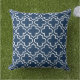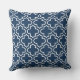 O travesseiro na moda apresenta um moderno padrão decorativo marroquino de quatrefoil em branco. Personalize o plano de fundo azul do marinho para coordenar com o decorador externo.