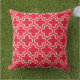 Na moda e travesseiro quadrado chic ao ar livre apresentam um padrão decorativo de quatrefoil marroquino em uma cor branca macia com cor vermelha de fundo. Personalize o plano de fundo para coordenar com a decoração exterior.