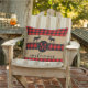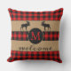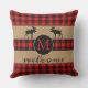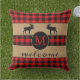 Divertido e fofo travesseiro decorativo ao ar livre com saudação de boas-vindas em um padrão clássico de xadrez preto e vermelho em branco no fundo da burlap. Na moda, design único com espaço para personalizar ou personalizar com seu nome de família monograma. Sotaque de decoração ao ar livre monograma original personalizado para decorar a varanda ou o pátio da sua casa de campo, cabana de tronco, refúgio de montanha, campo de pesca, lago ou casa de férias de rio.