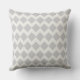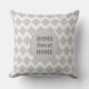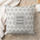 Lindo padrão geométrico de diamante cinza em um fundo quase branco. A frente da almofada tem um grande ponto cinza com o texto: Lar Doce Lar.
