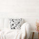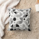 Este travesseiro moderno apresenta um padrão geométrico monocromático sem costura com várias linhas e formas em tons pretos e cinzas sobre fundo branco.