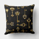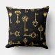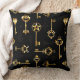 Padrão perfeito de chaves antigas, douradas e silhuetas em fundo preto.
