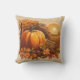 Paisagem automática com um sol de pôr, no primeiro plano está uma abóbora laranja. Maravilhoso movimento sazonal com cores de queda no lado frontal desta almofada, o lado de trás é apenas uma cor.