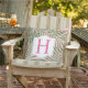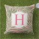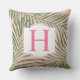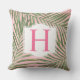 O design de travesseiro de estilo tropical apresenta um padrão verde de folha de palma de frondes em camadas com fundo de rosa claro. Quadro decorativo branco tem um monograma familiar inicial em rosa claro (pode ser personalizado) que você pode personalizar com o sobrenome inicial.