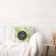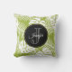 Um travesseiro com um padrão repetitivo de folhas de palma grandes sobre fundo verde-oliva. Trendy moderno e tropical. Um círculo preto com uma borda dourada colocada sobre cima com seu nome personalizado e dentro monograma.
