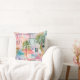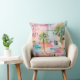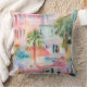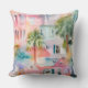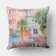travesseiro decorativo decorador de 20"x20" com uma pintura colorida de pequenas casas de cor-de-rosa e azul-pastel e palmeiras tropicais. Perfeito para sua casa de férias na praia.