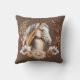 Um belo retrato de um Cavalo Palomino é colocado no centro de uma coroa de outono em tons de cinamão marrom, bronzeado e creme. O cavalo e a design de coroa são colocados sobre um fundo marrom médio. Ambos os lados do travesseiro têm a mesma imagem. *Você pode alterar a cor do plano de fundo escolhendo Editar o Design.