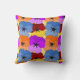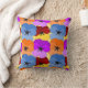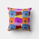 Este travesseiro decorativo tem um design de púrpura, azul, laranja e vermelho com as pincéis amarelas colocadas umas sobre as outras num campo de amarelo.