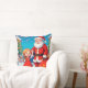 Uma ilustração colorida e alegre que mostra Papai Noel em um traje azul ao lado de uma jovem sorridente de vestido vermelho com um grande saco de presentes.