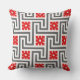 Art Deco Chave grega ou travesseiro de padrão labiríntico em cinzas/cinzas de grafite escura e branco, acentuado com travesseiro vermelho chinês profundo ao ar livre