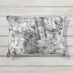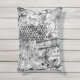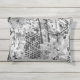 Este travesseiro decorativo apresenta um abstrato eclético que inclui círculos de listras-zebra. As cores variam de cinza (ou cinza) a carvão vegetal a preto.