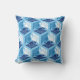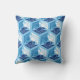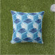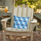 Travesseiro exterior em um clássico padrão quimono japonês de guindastes estilizados, arranjado em um padrão de hexágonos, em marinho/azul-indigo, azul-médio e branco, sobre um fundo azul-claro do céu