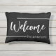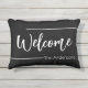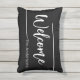 Bem-vindo está em um grande roteiro branco no centro do travesseiro. Este travesseiro preto também tem outra linha de texto de exibição na parte inferior. Você pode editar uma ou ambas as linhas do texto de exibição para criar uma mensagem personalizada, como o sobrenome do proprietário.