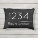 Este travesseiro de endereço residencial é preto. Você pode editar o texto branco para mostrar seu endereço de rua. Os dígitos do número da sua casa estão acima de uma linha horizontal e texto para o nome da sua rua.