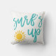 Aperte sua casa de praia, pátio ou área de piscina com nosso travesseiro decorativo exterior de verão! O design de citação bonito apresenta o "surf" em uma tipografia vibrante no estilo teal tropical, escrita à mão, com uma brilhante ilustração do sol amarelo. Travesseiro reverte para a turquesa e listras brancas.