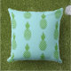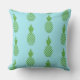 Este travesseiro decorativo exterior é mostrado em uma cor bonito do aqua com um impressão verde dos abacaxis.