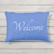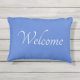 Travesseiro azul brilhante ao ar livre. Aproxime-se da mobília do pátio com um sinal de boas-vindas num travesseiro.