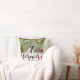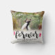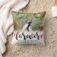 Travesseiro decorativo no branco com escrito para sempre em um roteiro bonito, bookended de cor cor-de-rosa, sobre sua foto do casamento. Adicione seus nomes e data do casamento demasiado. A parte traseira é listrada em cores de harmonização.