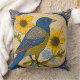 Ilustração colorida de um pássaro empoleirado em um galho, cercado por flores amarelas e margaridas azuis. A obra de arte apresenta um padrão pontilhado e uma mistura harmoniosa de tons azuis, amarelos e terrosos, criando uma composição alegre e vibrante.
