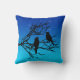 Travesseiro decorativo representando duas pequenas aves, pochadas em um galho, como uma silhueta preta contra um gradiente noturno do céu de turquesa profundo a azul cobalto, com aspersão de estrelas