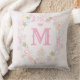 This pillow design has a preppy grandmillennial holiday treats crest with cookies, candies and a gingerbread house at the bottom on a pale pink background. You can personalize with your monogram initial. The back has a coordinating pattern.