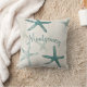 This coastal themed summer time throw pillow features watercolor starfish in various shades of sage green, from faint to deep, against a tan beige background on this beautiful double-sided cushion. Personalize with your family name in a playfully elegant script font arching slightly across the center in the deepest green of the darkest sea creature. The back of the beautiful custom cushion picks up the summer cream ivory for a background accented with a nautical compass in shades of green lifted from the starfish on the front. A modern serif font designates north, east, south and west on the compass points for a true maritime display.