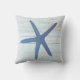 Travesseiro decorativo decorativo ao ar livre de praia para seu pátio, varanda ou área de piscina em um fundo de madeira rústica com design de peixe-estrela azul-aquarela.