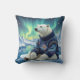 A polar bear, wearing a colorful sweater, sits on an ice floe as the aurora borealis illuminates the sky, creating a magical backdrop