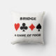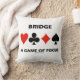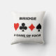 Se vocês jogarem muito bridge, vão entender que o jogo da ponte é sobre lembrar qual era a oferta, quais cartas foram jogadas e quais cartas ainda estão para serem jogadas. Seja você declarador ou defensor, o jogo da ponte requer muito foco. Os jogadores de ponte aproveitarão este travesseiro decorativo com quatro naipes de placa junto com o seguinte truísmo de ponte/ponte duplicada dizendo: "Bridge - A Game Of Focus".
