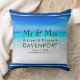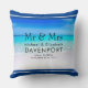 Um travesseiro comemorativo de casamento com seus nomes, local da cerimônia e data do casamento. Projetado com uma praia tropical arenosa. Um belo mar de turquesa à distância e águas cristalinas acariciando uma praia arenosa. Um céu azul brilhante no fundo.